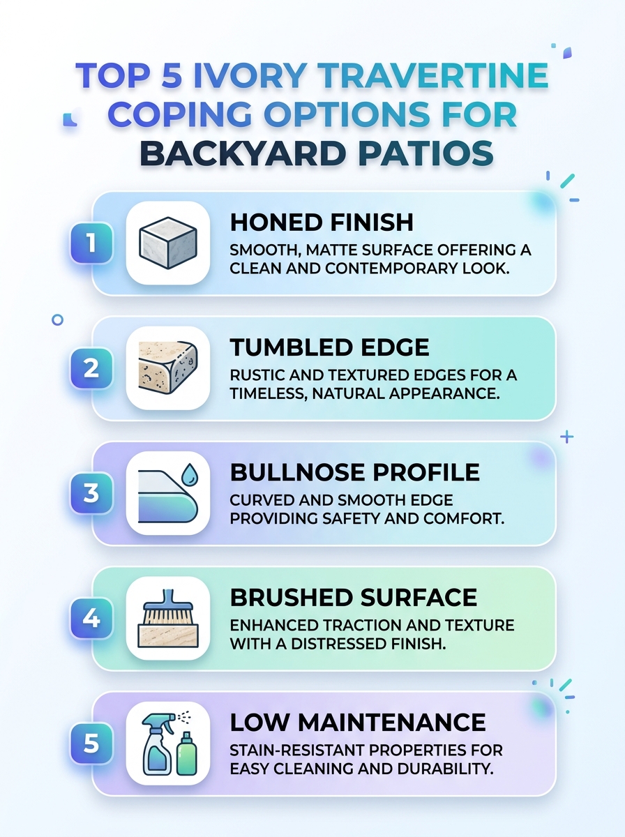 A quick visual guide to the top 5 ivory travertine coping options for backyard patios, highlighting styles, benefits, and installation considerations.